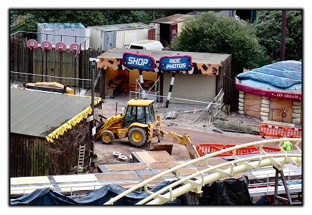 The ride shop and photo booth under construction. It suggests a possible mix of the prehistoric Ug Land theme and the new, speedy racing theme.