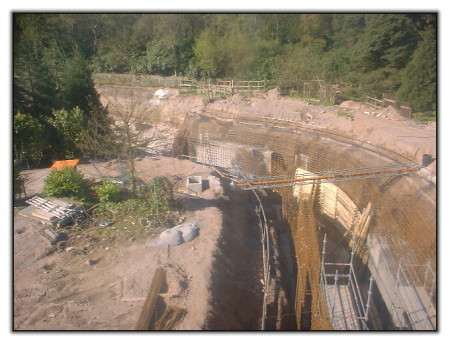 A shot of the tunnel construction from above, shows much iron work, ready for concrete pouring.
