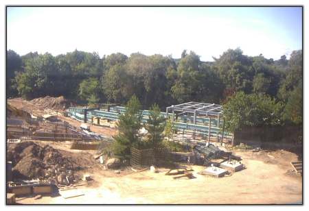 Looking across the site from the monorail, with the steel roof of the station being constructed.
