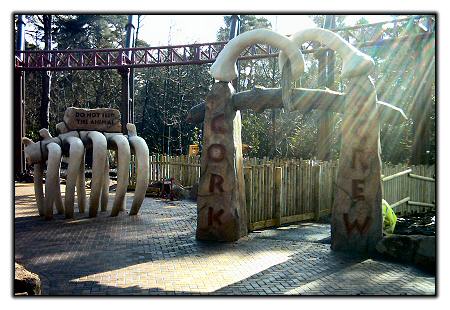 Corkscrew's queue line entrance, complete with "Do Not Feed The Animal" bones nearby.