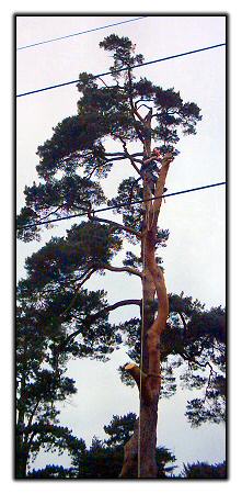 | This worker, who obviously doesn't fear heights, is hacking off branches of this tree with a chainsaw. The work is being carried out so that the Sky Ride does not collide with any branches. |