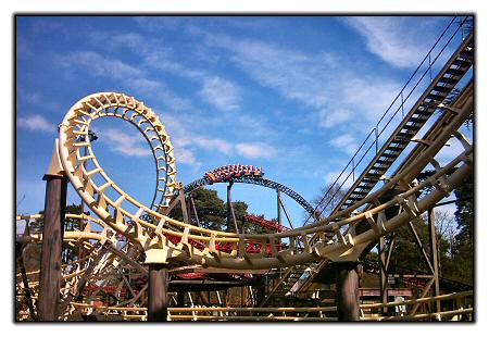 | A stunning photograph of Rita during testing, with one of Alton Towers' most famous icons, Corkscrew, in the foreground. |