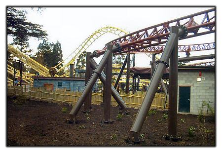 Looking towards Corkscrew, from the ride's exit path. Once again you will be able to walk under Rita as it flies past at high speed.