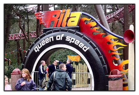 At Rita's queue line entrance. Note that a 3D sign of the ride's logo has been added to the top of the tyre theming.