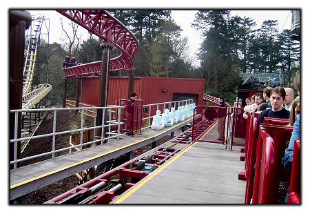 Looking down the platform. Note the staff member on the left stood in a "cage" to prevent any accidents as the ride moves from the offload to onload platform.