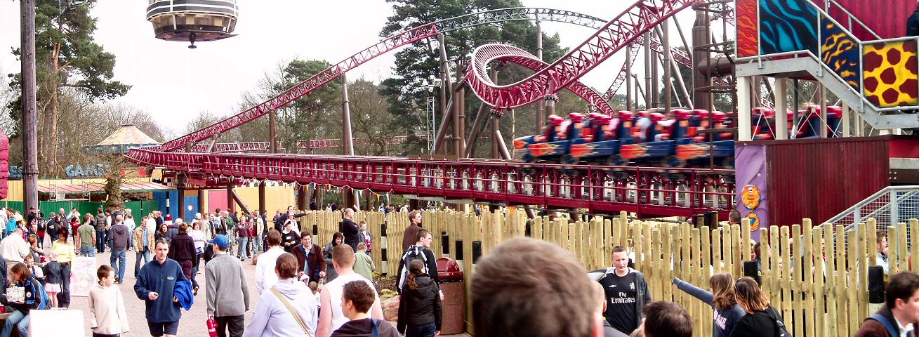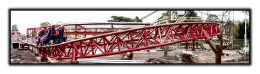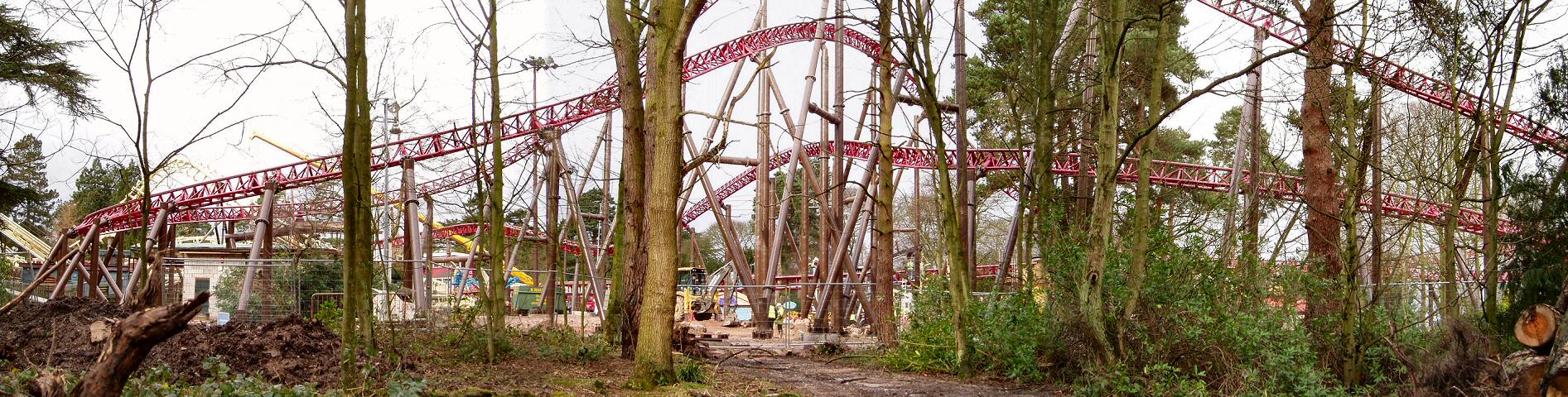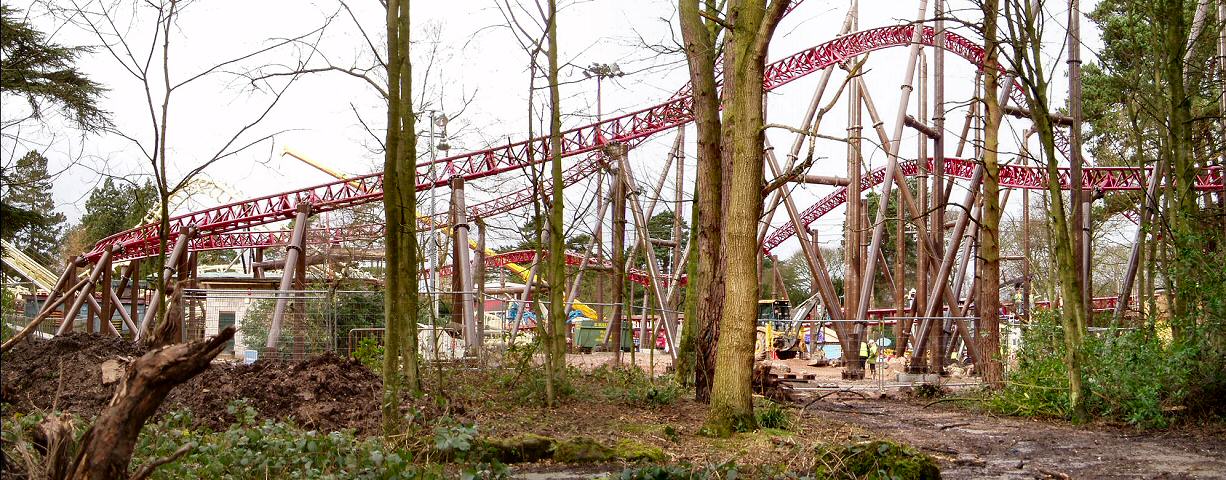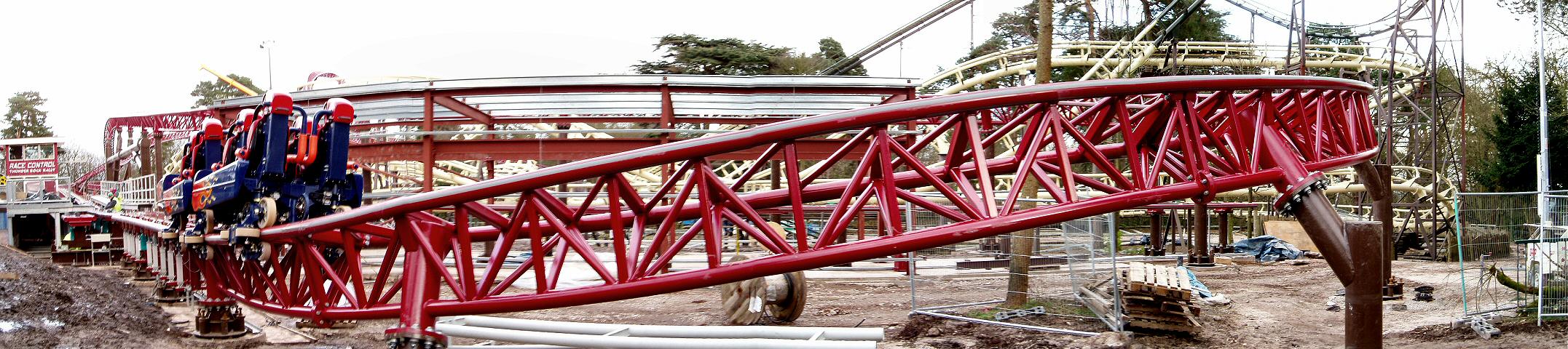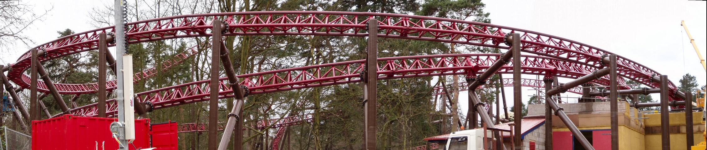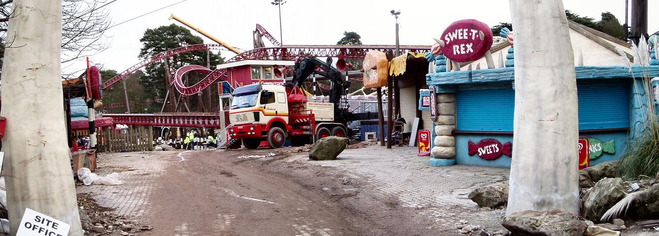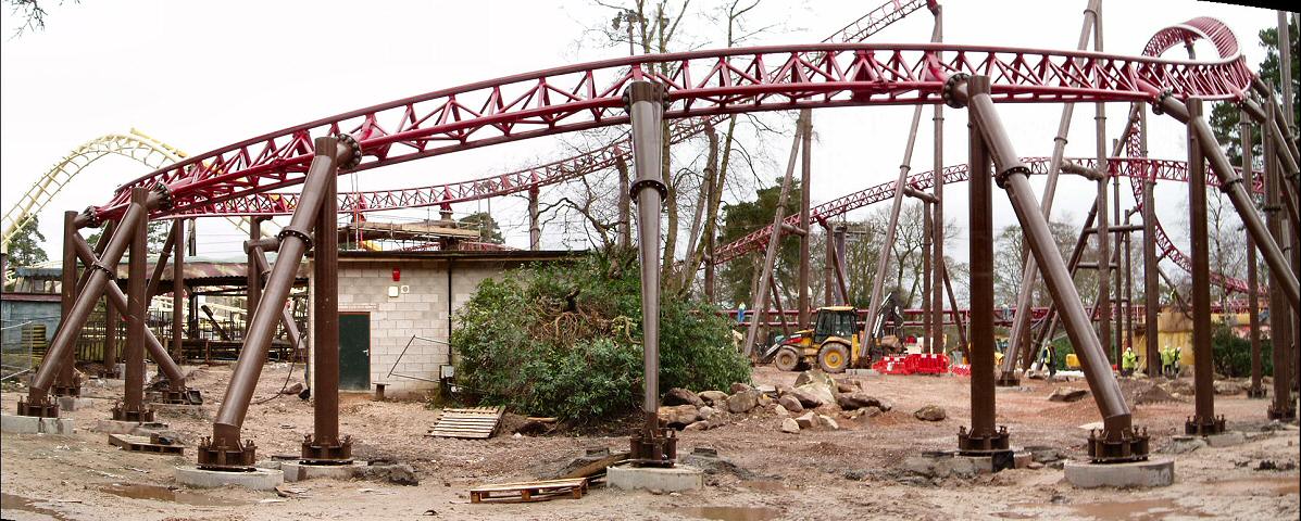 From the back of the construction site, we can see the now completed ride circuit The building towards the left of the photo is the Corkscrew on-ride photo shop.